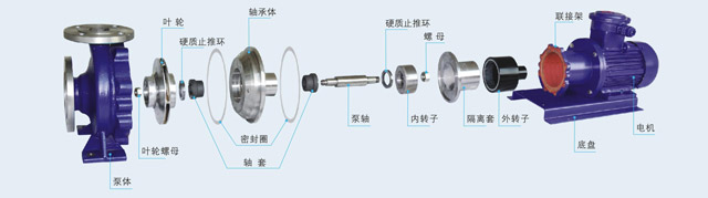 磁力離心泵通常由電動機,磁力耦合器和耐腐蝕離心泵組成。其主要特點是利用磁力耦合器的外磁鋼旋轉時,磁力線穿過間隙和隔離套,作用于內磁鋼上,使泵轉子與電動機同步旋轉,無機械接觸地傳遞扭矩。在泵軸的動力輸入端,由于液體被封閉在靜止的隔離套內,沒有動密封因而完全無泄漏。